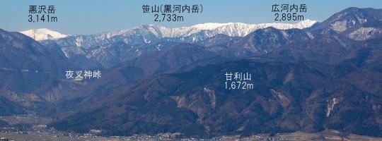 一番右側に見えるのが三角形の形をした甲斐駒ケ岳、